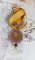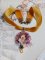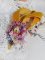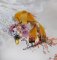 Un ensemble de fleurs accompagnent ce motif comme : clochettes, perles rondes nacrées, fleurs floquées velours, feuilles torsadées, étamines en fil de coton, nœud satin fait-main, rocailles japonaises et tchèques.