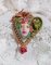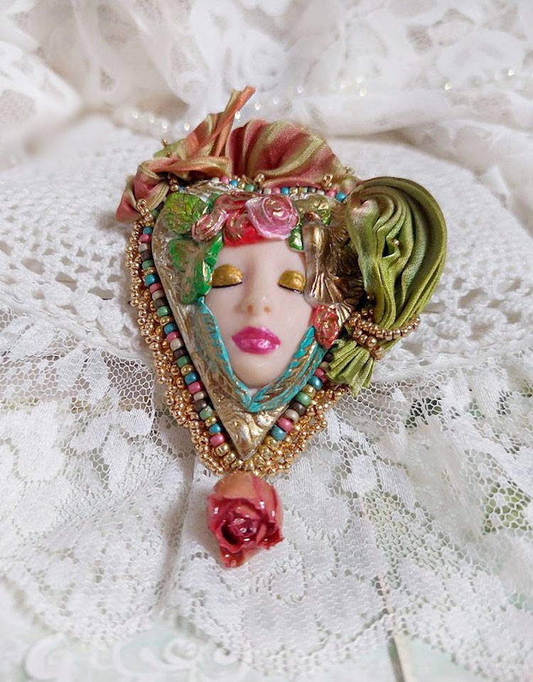 Le cabochon en forme de cœur pâte polymère représente un visage de femme « la Belle au Bois Dormant » peinte à la main avec des fleurs roses et une colombe, le tout est verni